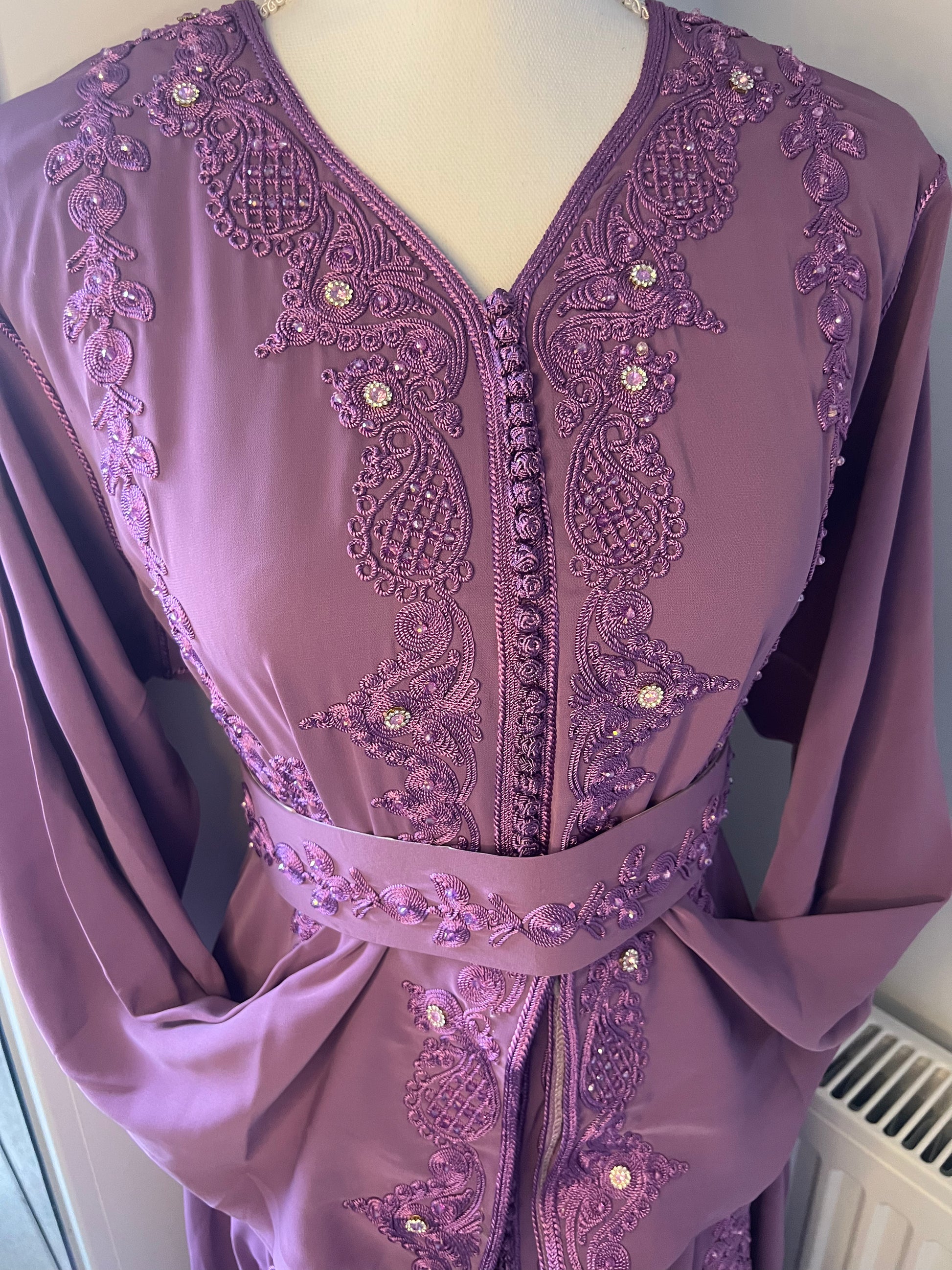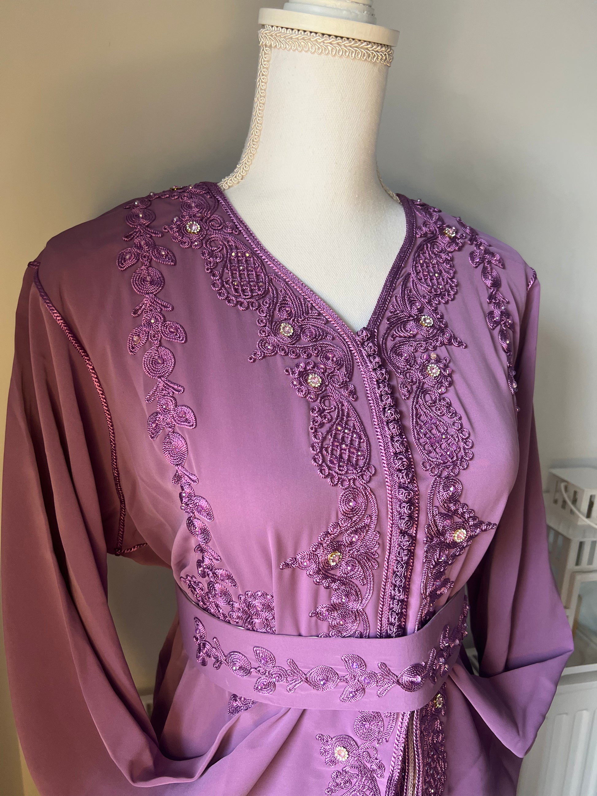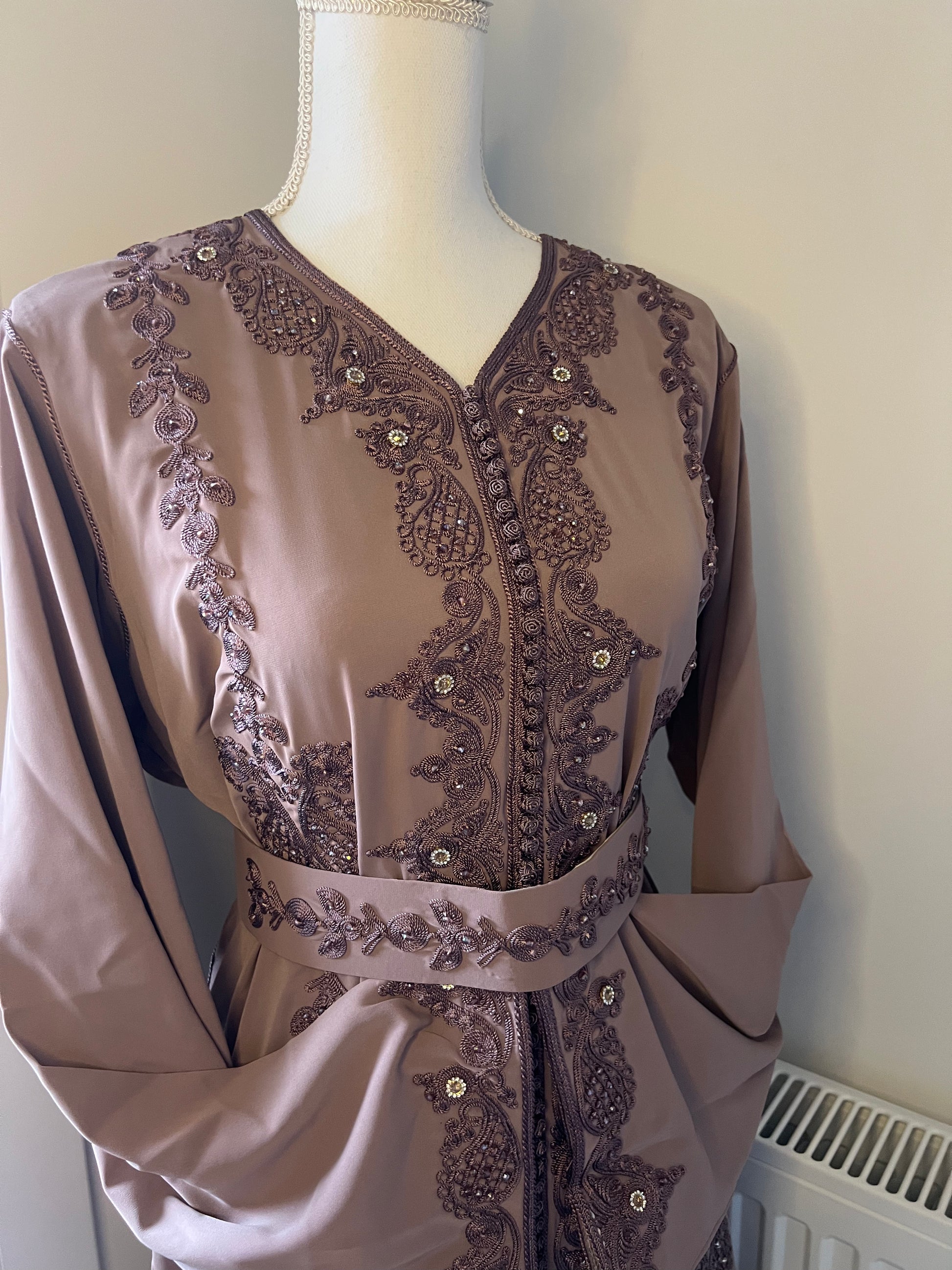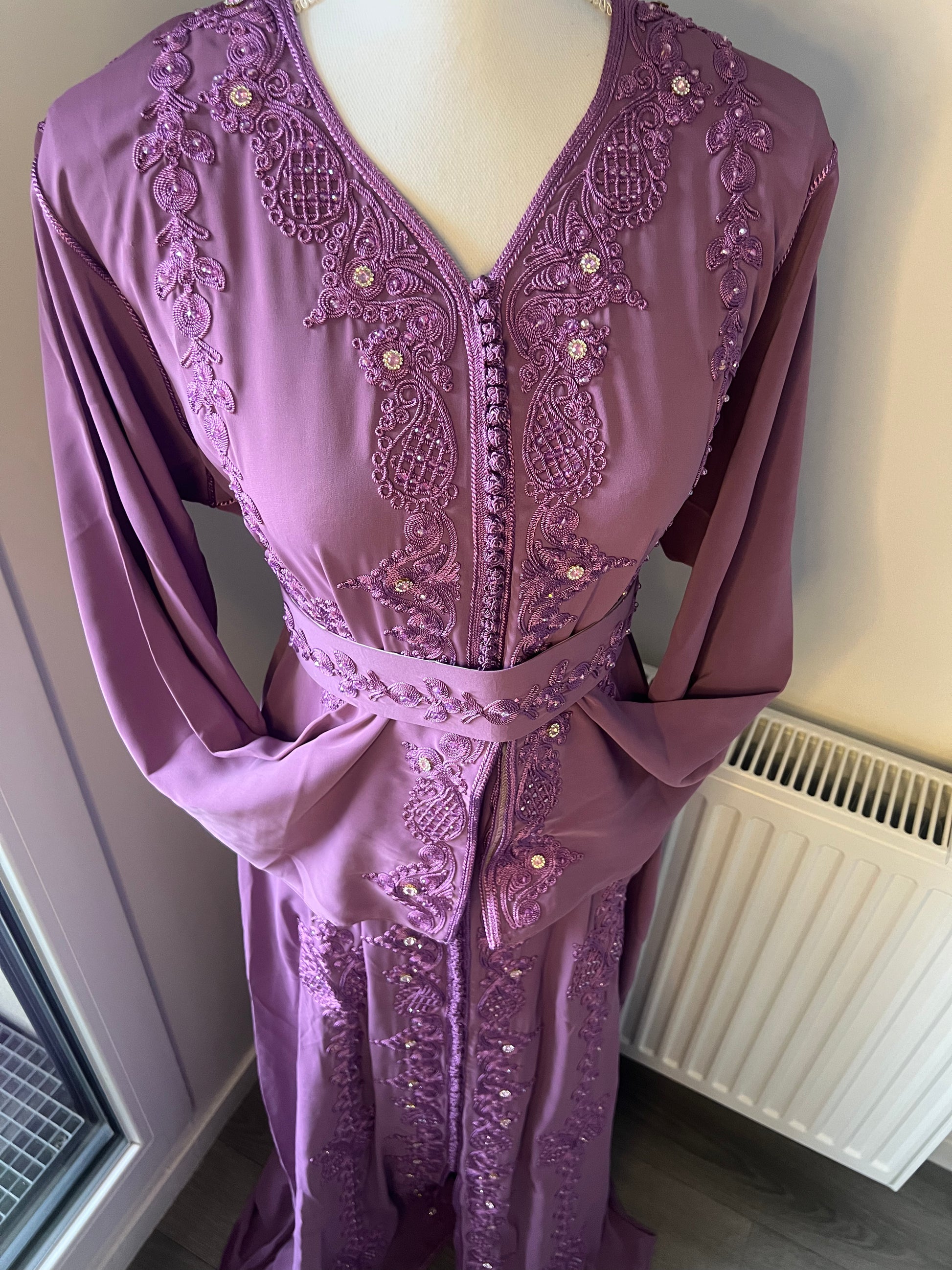 Ce caftan allie raffinement et modernité. Conçu avec un tissu fluide et orné de détails soignés, il offre une allure à la fois chic et traditionnelle. La ceinture assortie vient marquer la taille et sublimer la silhouette, ajoutant une touche finale de grâce et d’élégance.